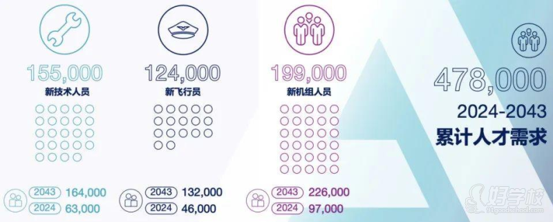 2024年底空客发布了《2024-2043年全球航空服务市场预测报告》。报告预测,中国民用航空服务市场将在未来二十年超越北美和欧洲,成为全球最大的航空服务市场,其市场价值将从2024年的230亿美元增长至2043年的610亿美元,实现三倍增长。在中国,未来20年就有47.8万专业人员缺口,包括15.5万名技术人员、12.4万名飞行员及19.9万名机组人员。