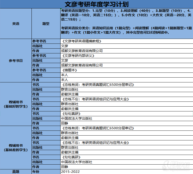 文彦考研开设课程:全日制高三式应试辅导班及专业课。课程内容包含:全国统考数学、政治、英语;教育学、心理学、计算机、西医综合等专业课,覆盖全国95%院校。