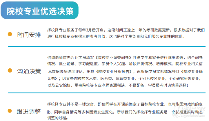 咨询档案查询 班主任约面 入学测试 专业院校考情分析 各科目全年学习计划+阶段学习计划