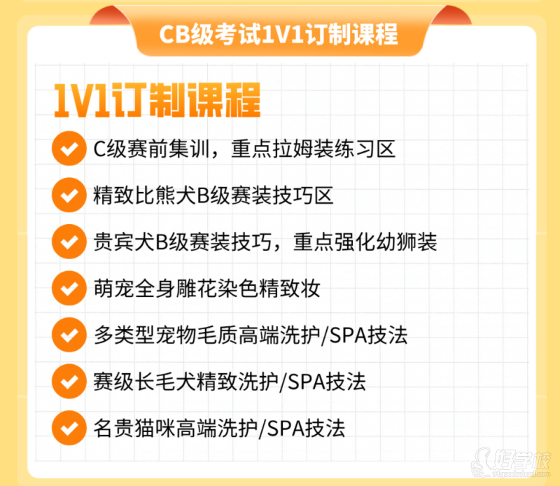 针对 C、B 级考试,提供 1V1 订制课程,内容有 C 级赛前集训(重点拉姆装练习区)、精致比熊犬 B 级赛装技巧区、贵宾犬 B 级赛装技巧(重点强化幼狮装)、萌宠全身雕花染色精致妆、多类型宠物毛质高端洗护 / SPA 技法、赛级长毛犬精致洗护 / SPA 技法、名贵猫咪高端洗护 / SPA 技法。