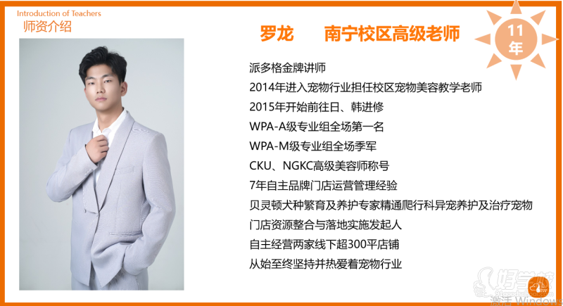 资质与荣誉:派多格校长、高级讲师,任派多格宠物职业技能培训学校南宁校校长,同时是南宁宠师阁教育咨询有限公司总经理;拥有派多格高级宠物美容师资质,师从台湾名师曾柏邨;是 CKU 与派多格联合审查员,也是 NGKC 高级美容师;具备 10 年宠物行业从业经验,6 年宠物门店管理运营经验。