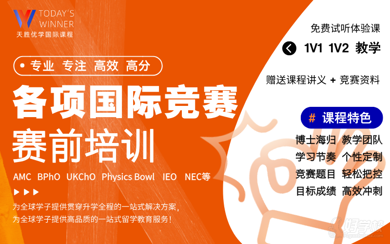 天胜优学国际课程(TODAY'S WINNER),秉持 “专业、专注、高效、高分” 的理念,为全球学子打造各项国际竞赛赛前培训课程,助力学子在 AMC、BPHO、UKChO、Physics Bowl、IEO、NEC 等国际竞赛中斩获佳绩,同时为学子升学全程提供一站式解决方案与高品质留学教育服务。