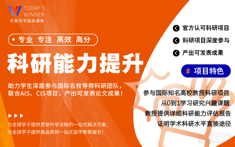 天胜优学国际课程推出的科研能力提升项目,秉持 “专业、专注、高效、高分” 的理念,致力于为全球学子提供贯穿升学全程的一站式解决方案与高品质留学教育服务。