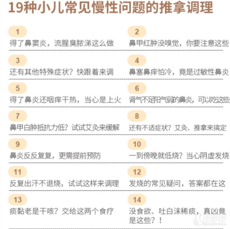 很多爸爸妈妈都知道,小儿推拿见效快疗效好,可是光知道效果不够啊!遇到问题到底推哪儿?推拿应该做多少次,做多久?频率应该怎样把握?什么情况下适合做?想给孩子做日常保健和预防,比如脾胃虚弱、抵抗力差、身高不够,该使用哪些配套的手法?推拿过程中,手法节奏不得要领?手痛手酸难以坚持?专业术语难以理解?对照图片找穴不准?除了推拿手法外,是不是还可以搭配其他方法,比如敷贴,来更好更快地处理孩子的病症?你是不是也有这些类似的困扰呢?是时候学习羊爸爸大专栏《小儿推拿实战指导大全》啦!专门为咱们这些有需求的家长准备的。课程中辨证、推拿、护理三管齐下,干货满满,判断对了孩子的症状后,你只需要听着击打的节奏跟着老师一起做就行了。