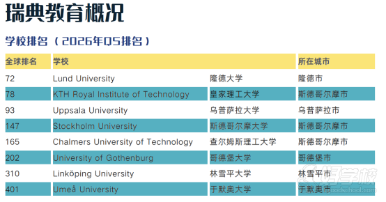 1) 成立于 1827 年,是瑞典最知名的理工院校,QS 2026 排名全球第 78 位,瑞典第 2,以工程技术领域的创新研究闻名,培养了众多科技带头者。