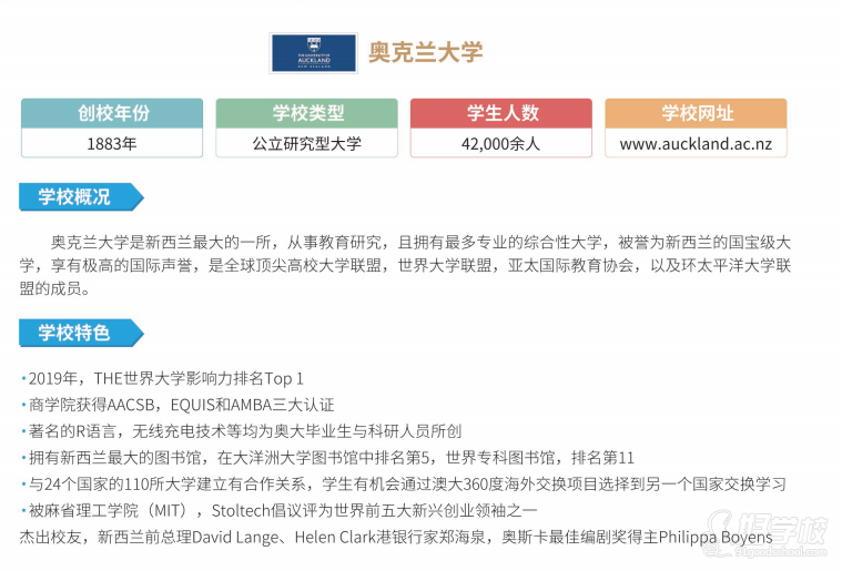 奥克兰大学是新西兰面积大的一所,从事教育研究,且拥有最多专业的综合性大学,被誉为新西兰的国宝级大学,享有极高的国际声誉,是全球知名高校大学联盟,世界大学联盟,亚太国际教育协会,以及环太平洋大学联盟的成员。