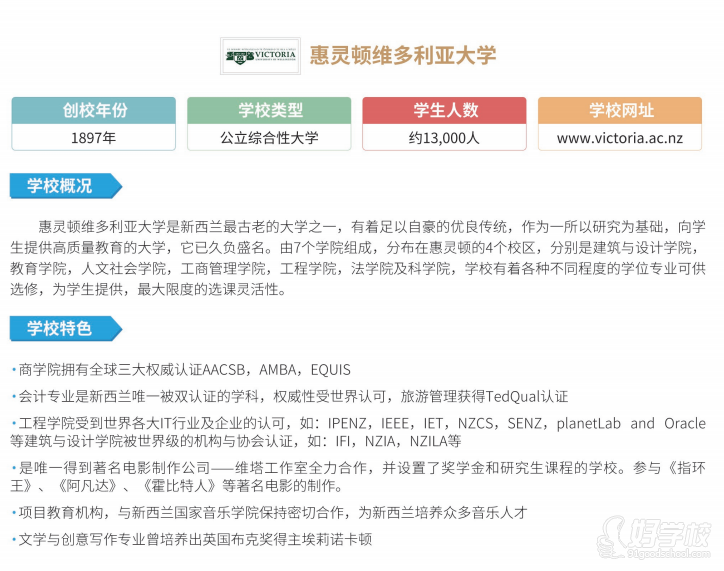 惠灵顿维多利亚大学是新西兰最古老的大学之一,有着足以自豪的优良传统,作为一所以研究为基础,向学生提供高质量教育的大学,它已久负盛名。由7个学院组成,分布在惠灵顿的4个校区,分别是建筑与设计学院,教育学院,人文社会学院,工商管理学院,工程学院,法学院及科学院,学校有着各种不同程度的学位专业可供选修,为学生提供,较大限度的选课灵活性。