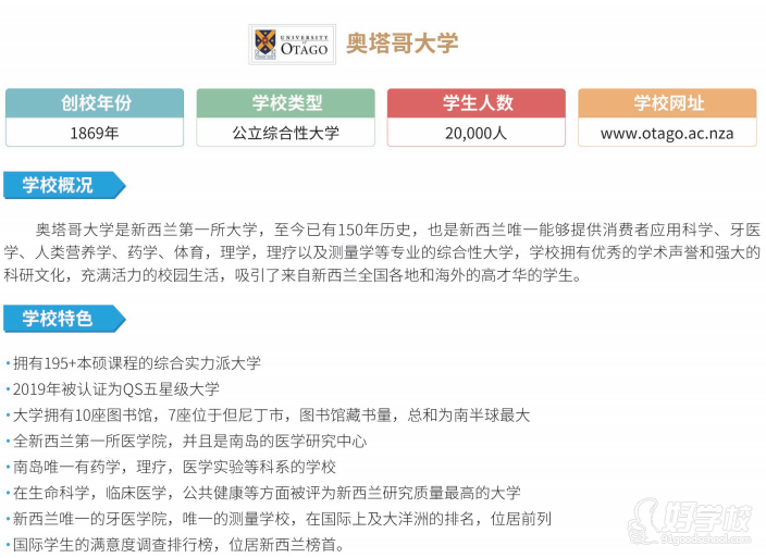 奥塔哥大学是新西兰第一所大学,至今已有150年历史,也是新西兰唯1能够提供消费者应用科学、牙医学、人类营养学、药学、体育,理学,理疗以及测量学等专业的综合性大学,学校拥有优秀的学术声誉和强大的科研文化,充满活力的校园生活,吸引了来自新西兰全国各地和海外的高才华的学生。