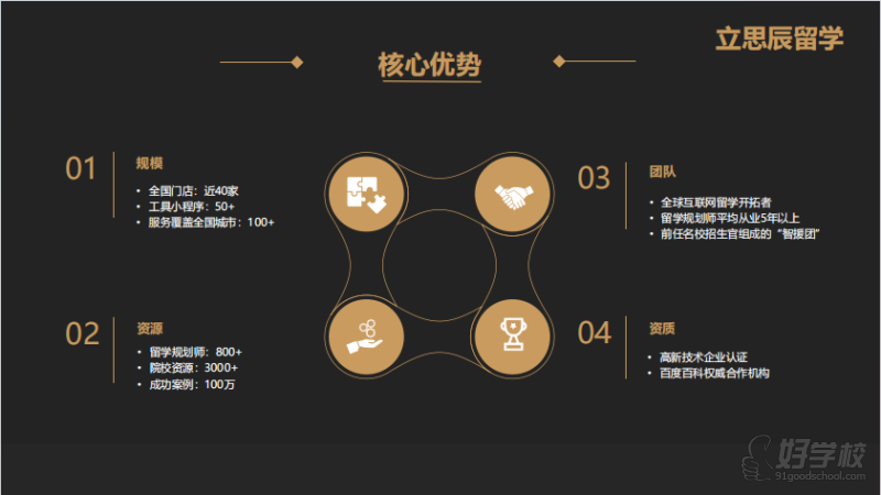 立思辰留学主要从事互联网留学办理、教育投资以及海外大学推广,是全球互联网留学开拓者。公司与美国、加拿大、英国、澳洲、新西兰、爱尔兰、瑞士、新加坡、马来西亚、泰国等30多个国家的800多家教育机构签约建立合作关系,协议覆盖3OOO多所海外大中小学。在全国三十多个城市,拥有数百个经验丰富的学咨询专家组成的留学专家团,高效有序的留学咨询系统和安全快捷的后勤堡垒队伍,每年为上万名留学生提供从咨询、申请、签证、接机及住宿等留学一条龙服务。