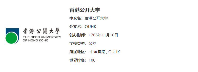香港公开大学(英文:The Open University of Hong Kong,缩写:OUHK),简称“公大”,前身为香港公开进修学院,是位于香港九龙何文田的法定大学,以「有教无类」和「宽进严出」为办学精神。大学于1989年由香港政府创办,本部由五所学院组成,分别为人文社会科学院、李兆基商业管理学院、教育及语文学院、护理及健康学院和科技学院。 香港公开大学在国际上享有崇高的声誉,是香港三所英联邦高等教育联盟的成员之一(另外两所是香港大学和香港中文大学),同时也是粤港澳高校联盟成员之一。大学所颁授学士副学位、学士学位、硕士学位和博士学位的学术资格获香港特区政府认可。 香港公开大学是由香港政府创办的自资大学,于成立之初,乃是一所以遥距教学为本的大专院校,现可说是两所大学合而为一,以多元模式办学。2001年起开办全日制课程,并在2007年起参与香港特别行政区大学联合招生办法(JUPAS)收生。现时,有逾9,600多名学生正在香港公开大学修读全日制学位课程,约占全港大学本科生人数六分之一。 现任校监是香港特别行政区行政长官林郑月娥女士。校长为黄玉山教授,曾担任香港科技大学和香港城市大学的副校长。