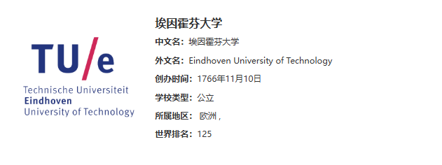 埃因霍芬理工大学(TU/e)由荷兰政府创建于1956年,已经发展成为一所拥有9个院系的理工科大学。学校设有19个本科专业、25个硕士专业,以及相关应用型硕士后,博士,博士后项目。TU/e 校区位于埃因霍温市中心,总面积约900亩(0.6平方千米),距离埃因霍温火车站约8分钟步行路程,可以乘坐火车、飞机等公共交通到达学校。