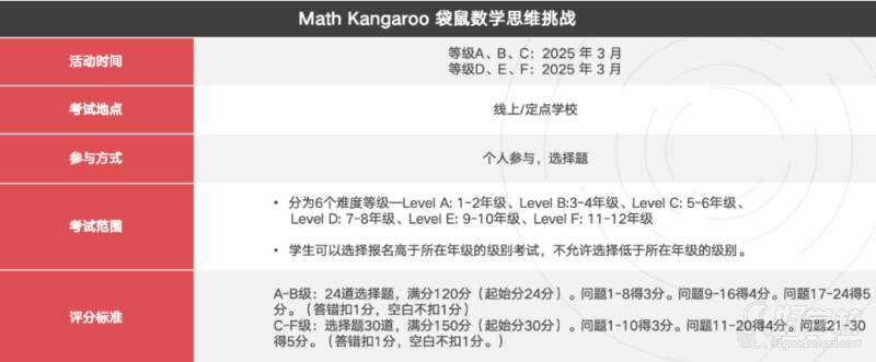 袋鼠数学思维挑战评估学生的逻辑组合能力和创造性解决问题的能力,大部分试题都是和实际应用相结合以及概念的逻辑组合。
