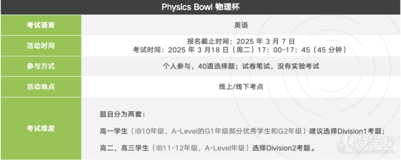 Physics Bowl物理碗竞赛适合9-12年级的学生,类似于美国物理奥林匹克挑战,需要学生物理知识扎实,致力于申请加拿大美国知名学校物理相关的理工科专业。