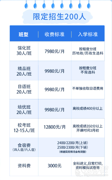 管理模式:采用双班主任全程跟踪管理模式,班主任一对一学科教学规划,未来院校目标制定,每班六名科任教师,额外配有答疑老师。班主任不授课,懂学科,懂规划,懂心理学