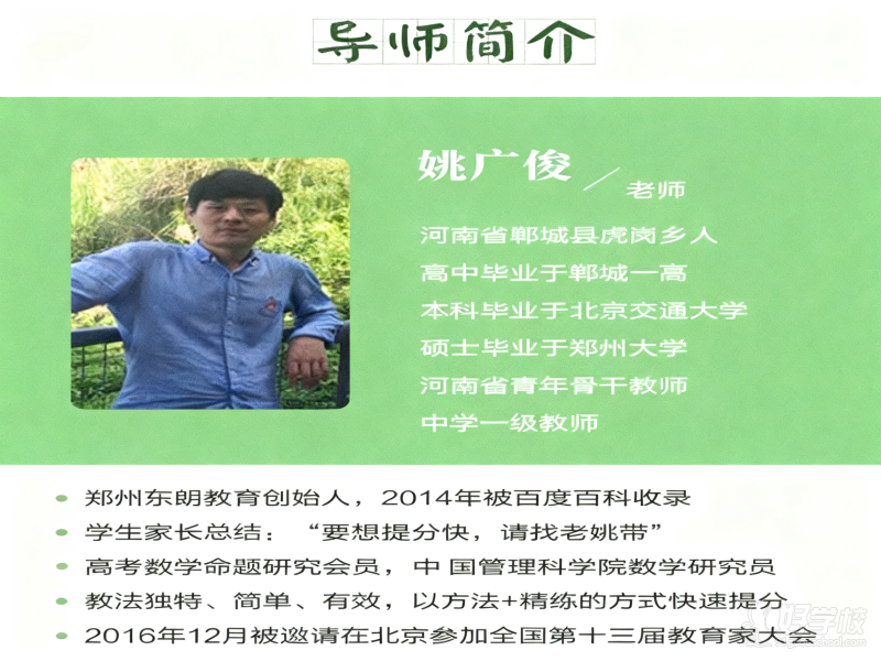 东朗教育创始人,2014 年被百度百科收录 ;学生家长总结:“要想提分快 ,请找老姚带 ”;