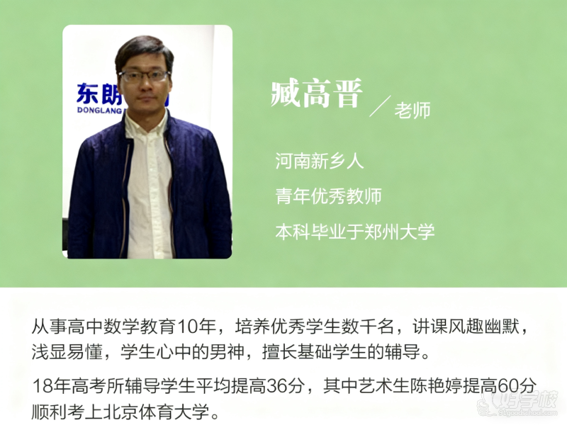 东朗教育是由数学专家级名师姚广俊老师联合省重点英 、理 、化 、政 、 史 、地教学骨干一起打造的针对高中的专业师资团队 。模块教学+套路 解题 ,一节顶三节 ,一天顶三天 ,创造无数例提分奇迹。17年品质口碑, 强大的教学团队 ,严格的教管体系 ,高效“ 四清 ”制度 完善的学习巩固系统 ,用成绩见证实力!