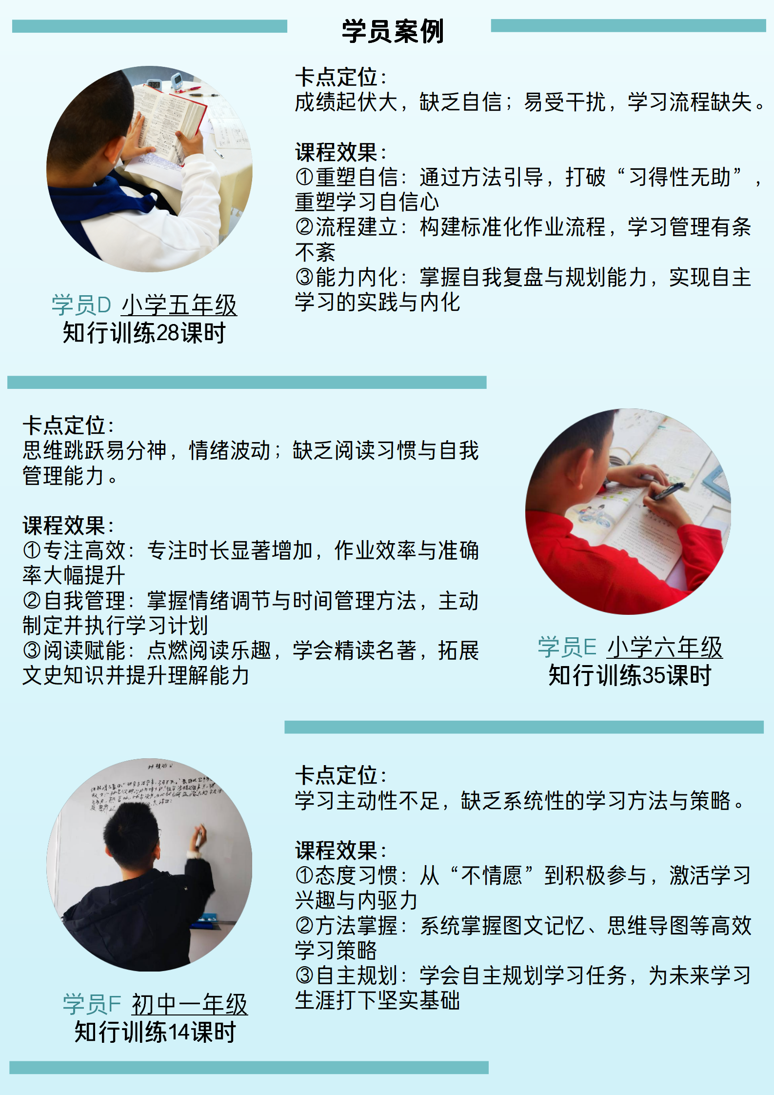 3. 知行训练:一对一定制化的训练指导,学生是在真实学习场景中(例如:跨学科知识整合、多感官记忆、对比式批判性学习等)中应用“目标引领、计划-执行-检查-改正”(G-PDCA)的闭环管理,验证与修正跨学科应用的学习策略,重塑底层学习力,提升学习效率与跨学科知识整合,提升学习掌控感,激发内驱力,自然提升学业成绩。