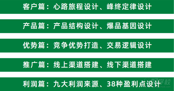 • 课程内容:通过业务模式、市场策略的“强化输出”,助力企业探索新盈利点;教授“自主挖掘方法”,实现“授之以渔”的持续盈利能力。