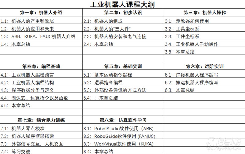 1、 FANUC机器人软件使用介绍及下载安装与使用。2、建立系统工作站。3、坐标系讲解。4、 FANUC机器人备份与恢复5、 FANUC机器人示教器的使用方法。6、FANUC机器人零点标定。7、FANUC机器人基本数据类型。8、 RAPID程序结构。9、FANUC机器人运动指令讲解。10 、FANUC机器人轨迹示教。 |