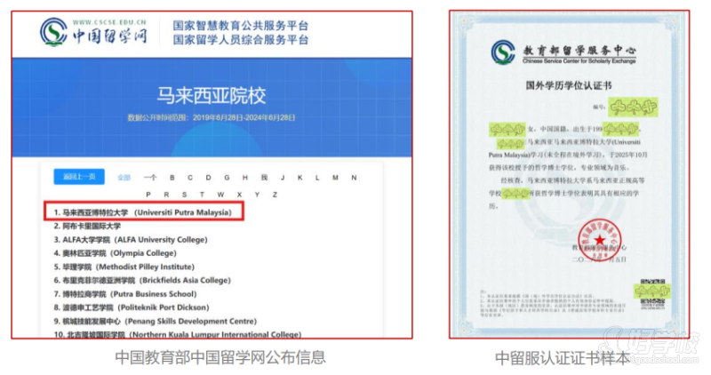 博特拉大学是经中国教育部认可且由中国留学网公布的高等学校,证明其所颁发学位学历证书在所属国获得承认的有效性。同时作为海外重点大学之一,可授予大学学士、硕士及博士学位,学生按正规流程申请学习并顺利毕业,且达到中国教育部留学要求后,可正常申请并办理中国教育部留学服务中心的学历学位认证。