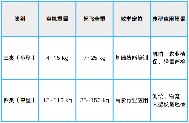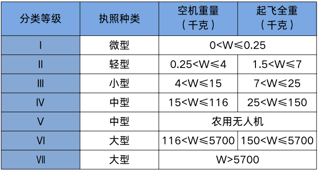 目前,无人机执照主要分为4种机型,分别是多旋翼、垂直起降固定翼、固定翼和直升机。不过,现阶段最常用的是多旋翼和垂起固定翼。按重量划分无人机可分为微型、轻型、小型、中型、中型农用无人机和大型无人机,即I、II、III、IV、V、XI类无人机;按民航局标准要求,III类(小型)及以上的无人机需要持有民用无人驾驶航空器执照。