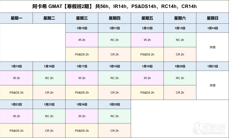 通过 56 小时寒假集中训练,覆盖 GMAT IR、PS&DS、RC、CR 四大模块(各 14h),针对性夯实 GMAT 考试核心知识点与解题逻辑,助力冲刺商科研究生申请所需的 GMAT 高分。