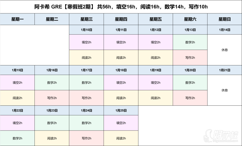 通过 56 小时寒假集中训练,覆盖 GRE 填空、阅读、数学、写作四大模块(各 14h),针对性夯实 GRE 考试核心能力,助力冲刺研究生申请所需的 GRE 高分。