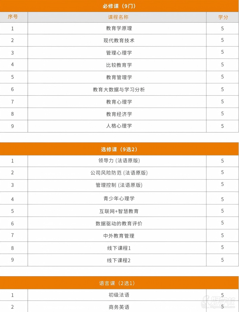 教育管理硕士学制为18个月,共12门课程,其中9门必修课,2门选修课,1门1语言课,修满60学分进入论文撰写阶段。