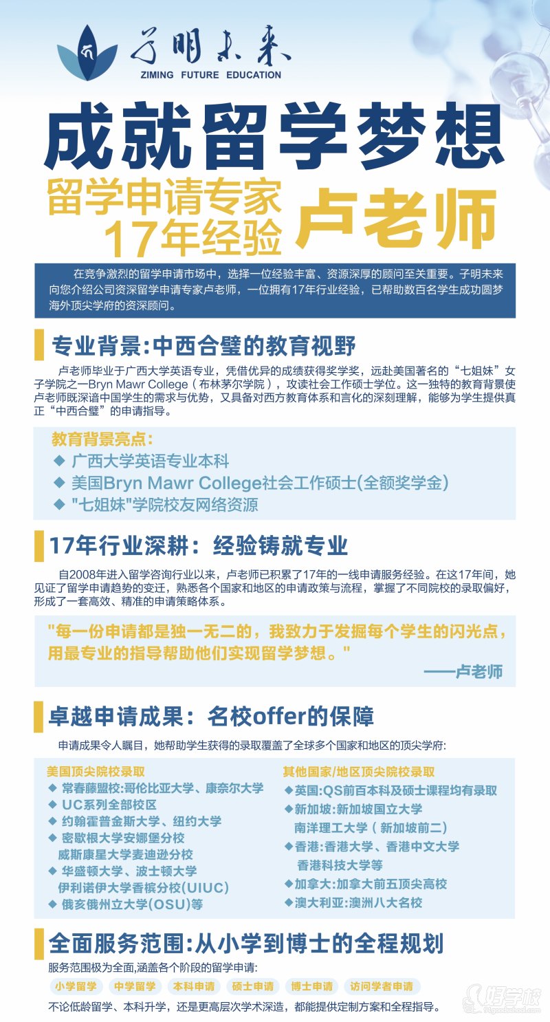 卢⽼师毕业于⼴西⼤学英语专业,凭借优异的成绩获得奖学⾦,远赴美国知名的“七姐妹”⼥⼦学院之⼀Bryn Mawr College(布林茅尔学院),攻读社会⼯作硕⼠学位。这⼀独特的教育背景使卢⽼师既深谙中国学⽣的需求与优势,⼜具备对西⽅教育体系和⽂化的深刻理解,能够为学⽣提供真正“中西合璧”的申请指导。
