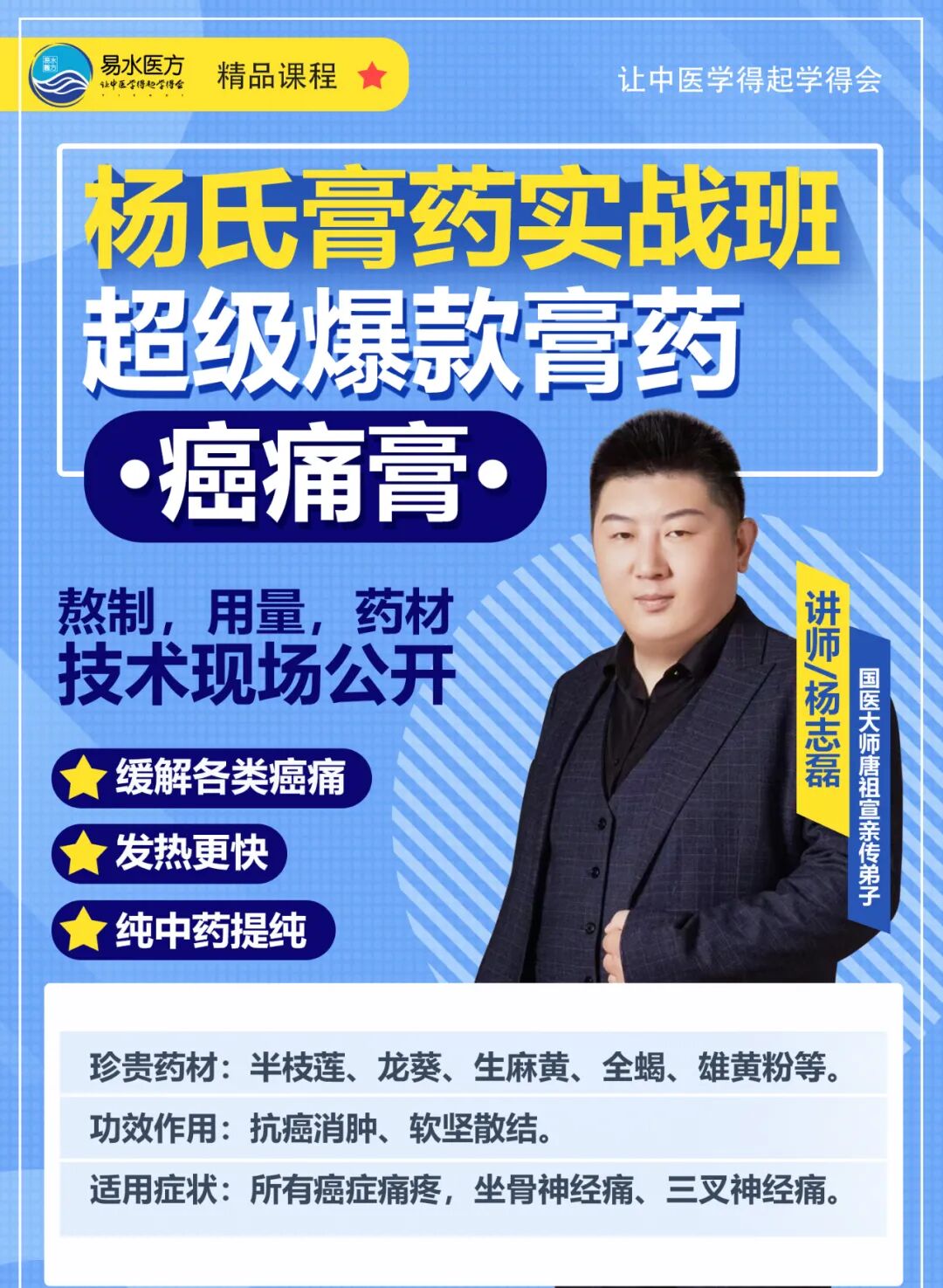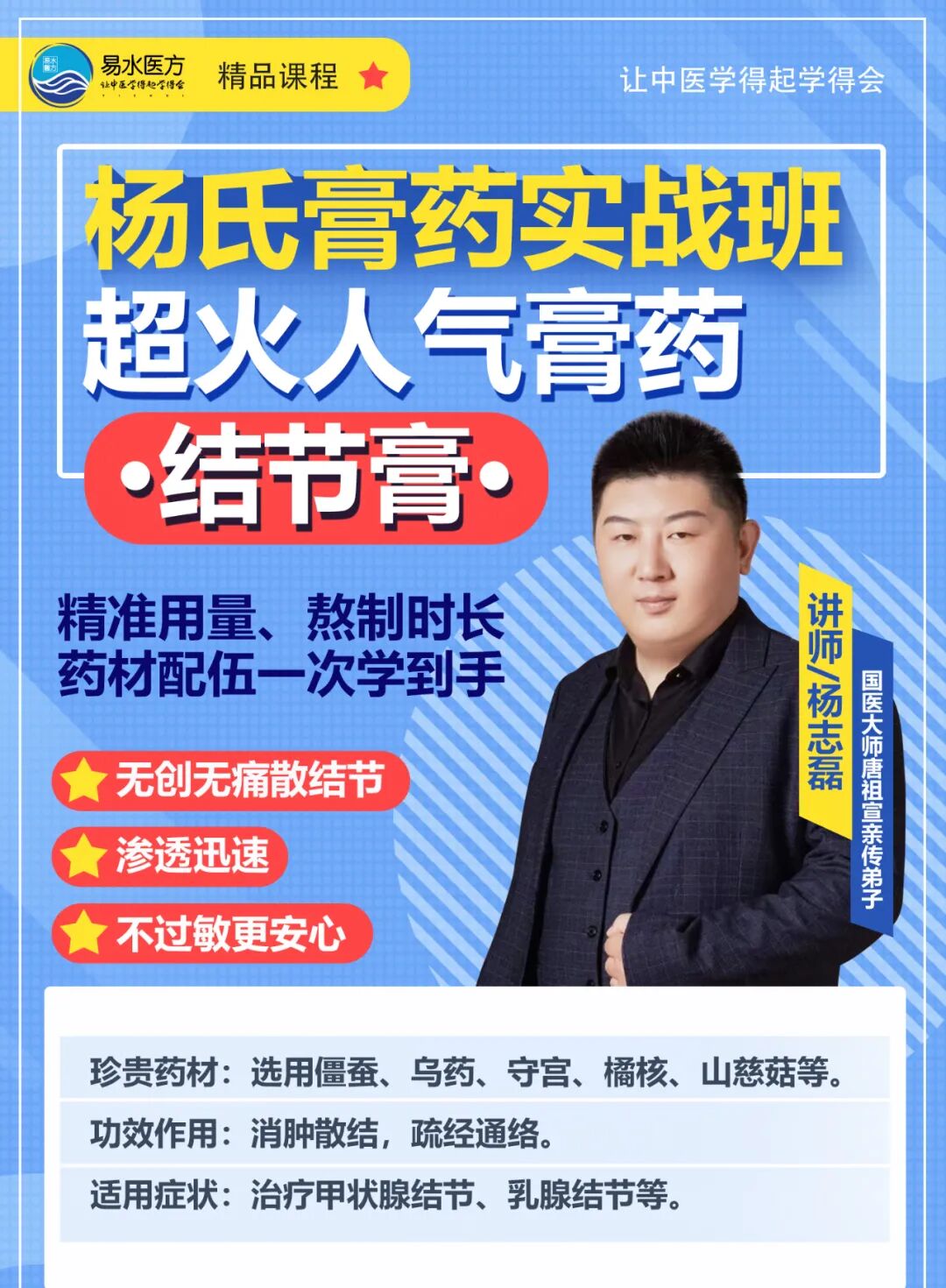 杨志磊老师在中医诊疗方面有多年的临床经验,其杨氏膏药累计受众群体15万人以上,杨老师对中医人才的培养有一套独特的方法论,带过的学生现已遍布全国各地诊所,和养生管等医疗机构。