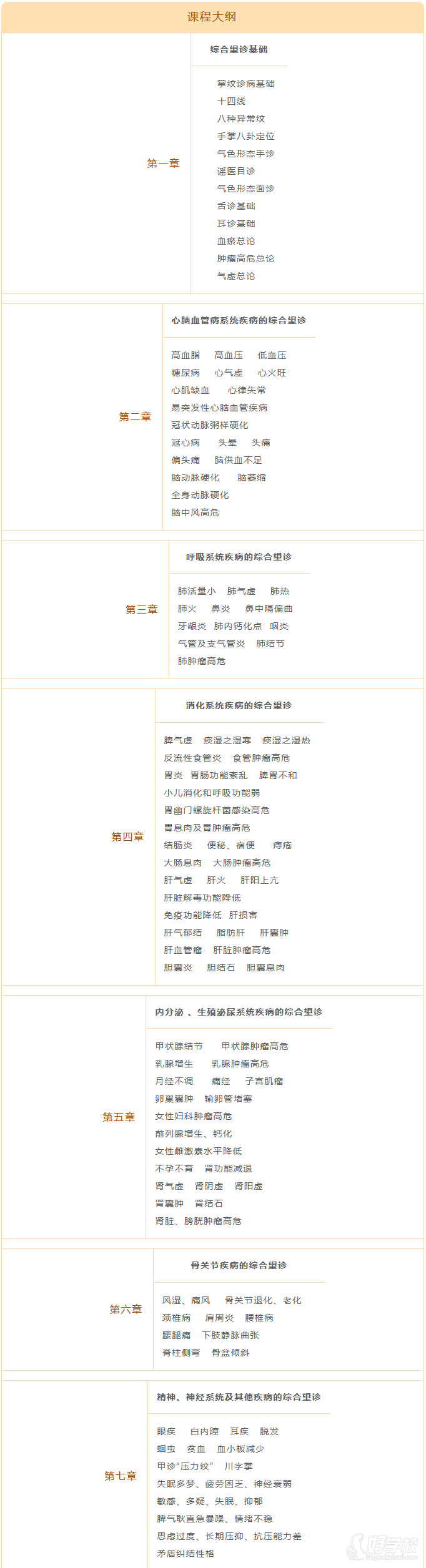 课程主要从综合望诊基础知识与临床疾病诊断两大方面进行讲解,教您掌握五维综合望诊基础技能,同时吕丽老师也将自己30多年临床看诊经验总结整理分享给大家,帮助大家快速掌握通过五维综合望诊准确诊断七大系统百种疾病!以下是课程大纲!