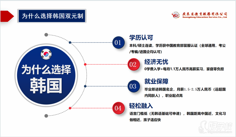 6、联合监管:此项目由广东省教育服务有限公司、韩国教育部、院校和企业四方共同监管, 管理体系完善,服务到位,力保安全。