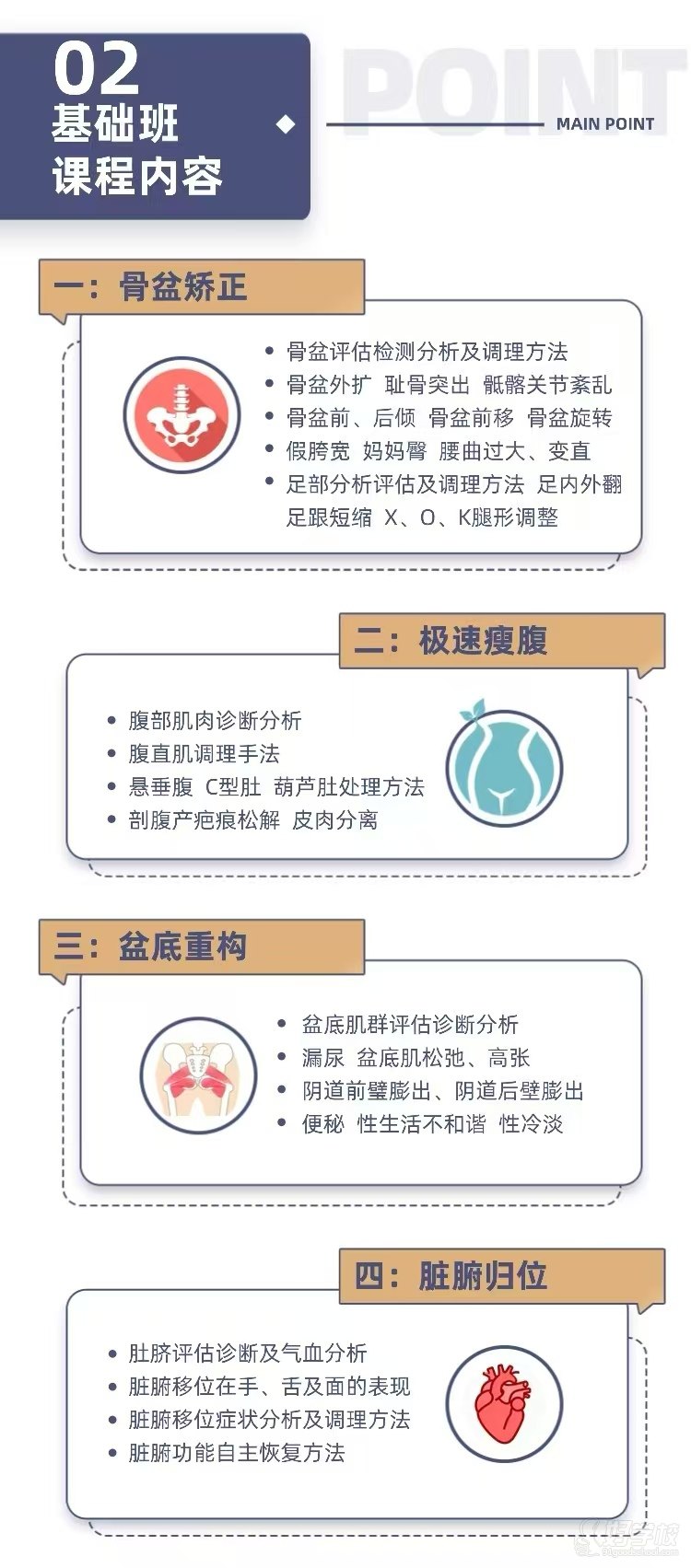 培训课程紧扣市场刚需,每年开设多场康复类专题培训,覆盖产后康复与体态调理全领域:从徒手骨盆矫正、极速瘦腹、盆底重构、脏腑归位等产后核心项目,到疼痛管理、含胸驼背矫正、脊柱侧弯康复、全身整脊塑形、脏腑疾病调理等热门课题,几十种课程项目层层迭进,手把手理论➕临床带教传授硬核手艺,让每一位学员手握一技之长,筑牢职业铁饭碗。