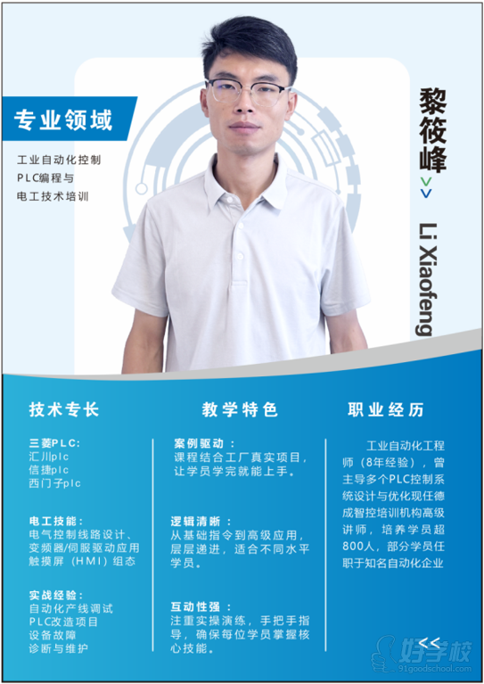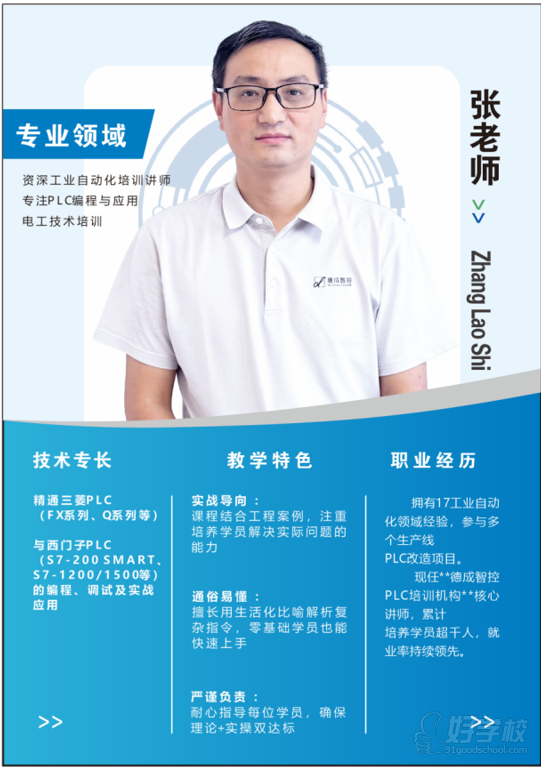 现任德成智控PLC培训机构核心讲师,累计培养学员超千人,就业高。