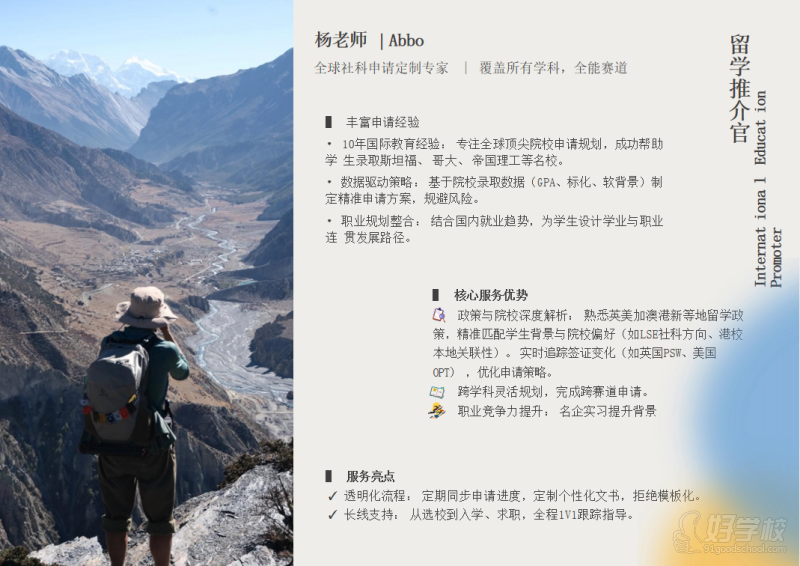 服务宗旨:每一个学生都有着不一样的未来,根据他们的个性去定制一个走向他们未来目标的计划,才是一个成熟合格的留学公司应该做的事情。