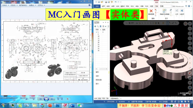 第一阶段MasterCAM入门画图: MC入门基本操作,MC操作界面与菜单布局,MC线框直线、圆弧、椭圆、矩形、多边形、倒角、倒斜角、修剪与打断等命令,MC图形转换平移、旋转、投影、镜像等操作,MC实体建模,MC曲面画图,MC模型准备实体修改实体与推拉编辑,MC工程图与标注尺寸,MC图形文件格式转换。