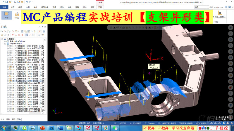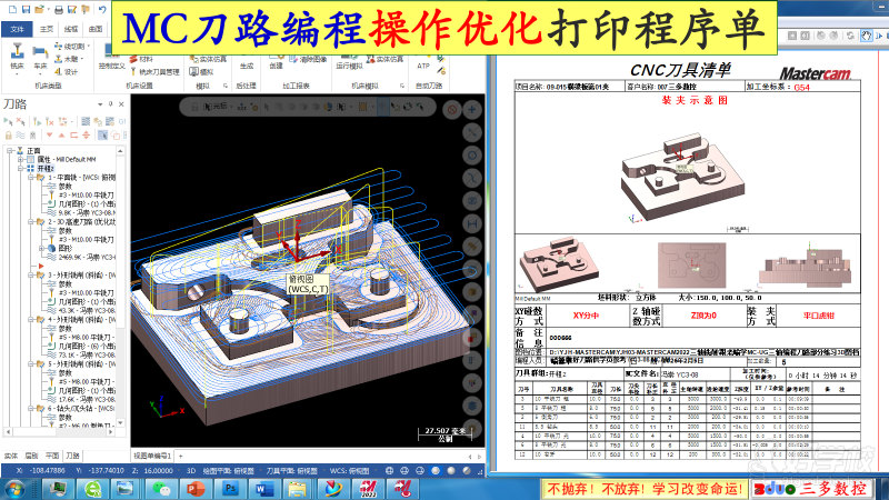 第二阶段MasterCAM刀路编程操作: 金属材料加工基础,CNC数控加工工艺,MC2D刀路之外形加工,面铣加工,挖槽加工,2D动态铣削加工,区域加工,熔接加工,模型倒角加工,钻孔加工,全圆铣削加工,螺纹铣削加工,高级钻孔加工;MC3D刀路之曲面开粗挖槽加工,优化动态粗切(3D动态开粗)加工,曲面残料加工,曲面平行精加工,曲面等高精加工,曲面等距环绕精加工,曲面流线精加工,曲面清角精加工,MC四轴五轴定位加工,MC替换轴四轴联动加工,MC刀路轨迹编辑与优化,MC后处理修改,MC外挂与CNC程序单制作打印。