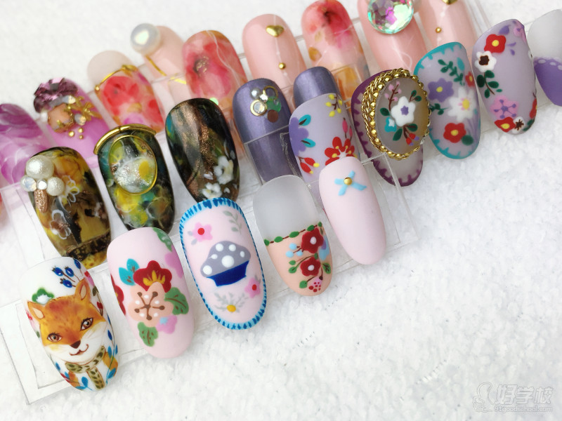 1. 线条掌控练习 2. 晕染类款式、INS 风等热门款 3. 花卉 / 猫眼 / 立体魔镜粉等款式实操 4. 彩绘 / 卡通 / 节日款教学 |