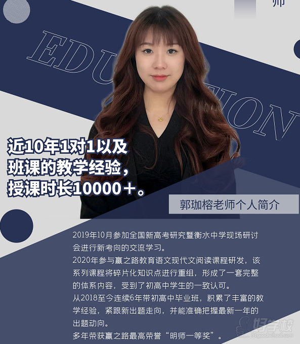 2020年参与赢之路教育语文现代文阅读课程研发,该系列课程将碎片化知识点进行重组,形成了一套完整的体系内容,受到了初高中学生的一致认可。从2018至今连续6年带初高中毕业班,积累了丰富的教学经验,紧跟新题目走向,并能准确把握新一年的题目