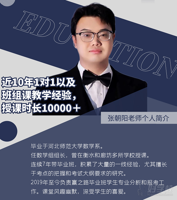 毕业于河北师范大学数学系。任数学组组长,曾在衡水和廊坊多所学校授课。连续7年带毕业班,积累了大量的一线经验,尤其擅长于考点的把握和考试大纲要求的研究。2019年至今负责赢之路毕业班学生专业分析和报考工作。课堂风趣幽默,深受学生的喜爱。