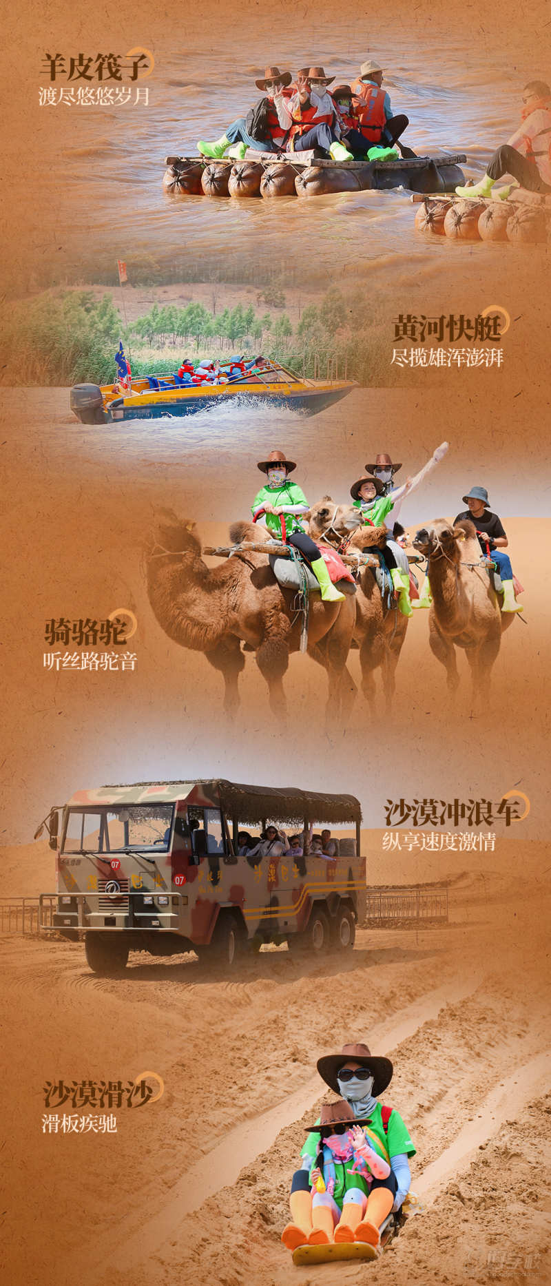沙坡头“沙漠迪士尼”:包含黄河快艇、羊皮筏子、沙漠冲浪、骑骆驼、滑沙、黄河玻璃桥等项目