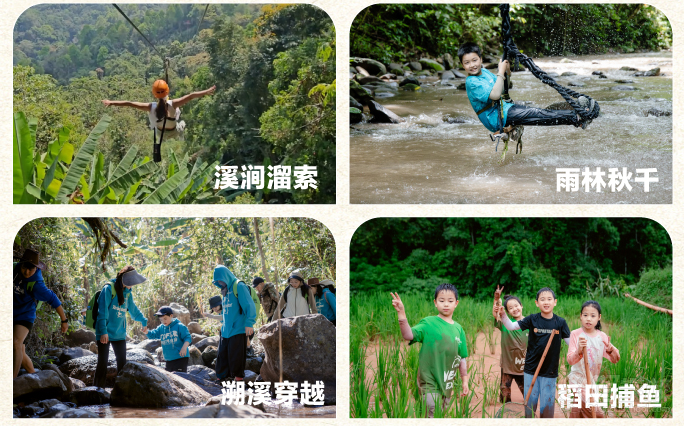 雨林溯溪、稻田捕鱼、漂流水战、露营夜观、篝火晚会、溜索&秋干、咖啡课堂、告庄傣拍、非遗比赛(织傣锦·制傣陶+贝叶经)
