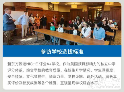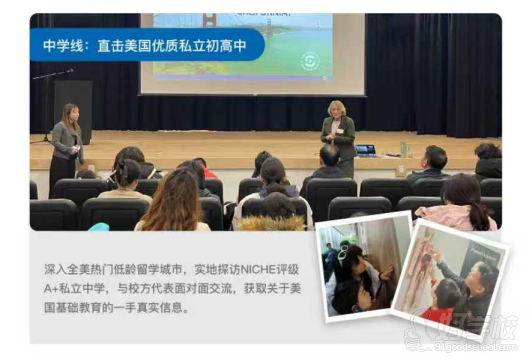 1.优质私立中学参访:实地探访 NICHE 评级 A + 私立高中,与校方代表面对面交流,从师资、课程、校园设施等维度直观了解美国基础教育。