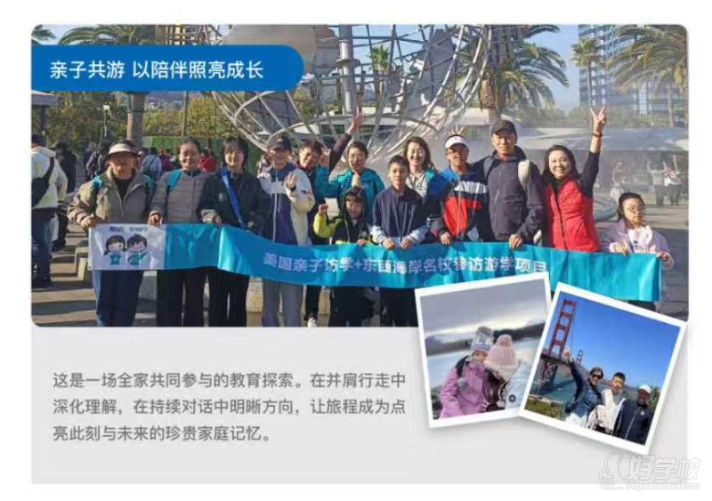 打造一场 “家庭共赴的教育发现之旅”,让家长与孩子一同走进美国优质私立中学与名校,直观感受美式教育氛围,清晰规划留学路径;同时通过东西海岸人文巡礼,拓展全球视野,增进亲子情感联结,实现家庭共同成长。