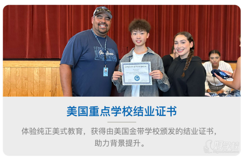 1.加州插班学习:进入加州金带 / 杰出认证重点学校,同步美国课堂(含世界史、数学、科学、艺术等多元课程),结束后获学校官方结业证书。