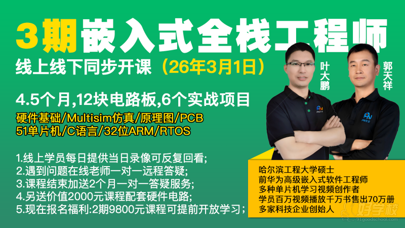 郭天祥,哈尔滨工程大学本科,比赛获奖保送硕士研究生,大学期间开始创业,十天学会单片机创始人,新概念51单片机书籍售出70万册,18年科技研发企业,电子电路设计工作经验,聚焦嵌入式线上/下培训,学习知识,改变命运,从此刻开始