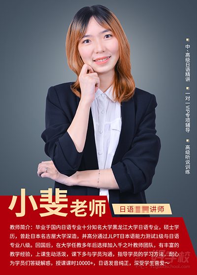 教师简介:毕业于国内日语专业十分知名大学黑龙江大学日语专业,硕士学历,曾赴日本名古屋大学深造,并高分通过儿PT日本语能力测试1级与日语专业八级。回国后,在大学任教多年后选择加入千之叶教师团队,有丰富的教学经验,上课生动活泼,课下多与学员沟通,指导学员的学习方法,耐心为学员答疑解惑,授课课时10000+,日语发音纯正,深受学生喜爱。