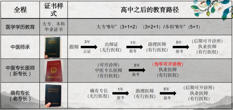 主要为非学历教育的中医传承模式,适合无医学专业背景但希望从事中医行业的人群,核心是