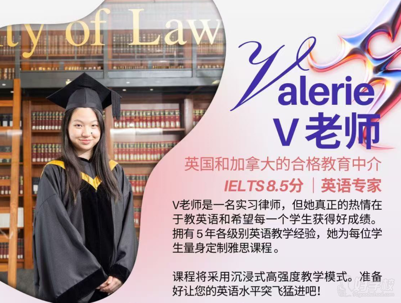V老师是一名实习律师,但她真正的热情在于教英语和希望每一个学生获得好成绩。拥有5年各级别英语教学经验,她为每位学生量身定制雅思课程。