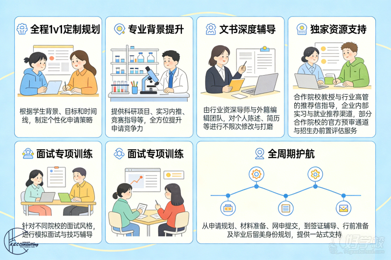- 专业背景提升:提供科研项目、实习内推、竞赛指导等,全方位提升申请竞争力。